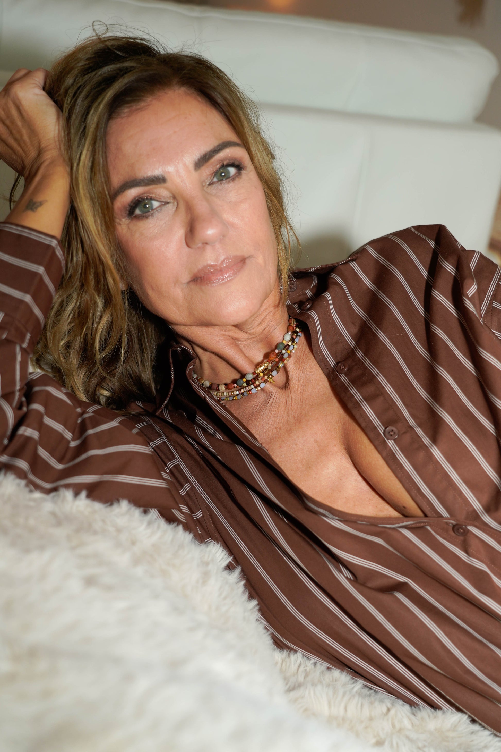 Zachte, natuurlijke tinten van zand en terracotta gobi jasper kralen worden gecombineerd met grijze accenten en een subtiel gouden kruisje.