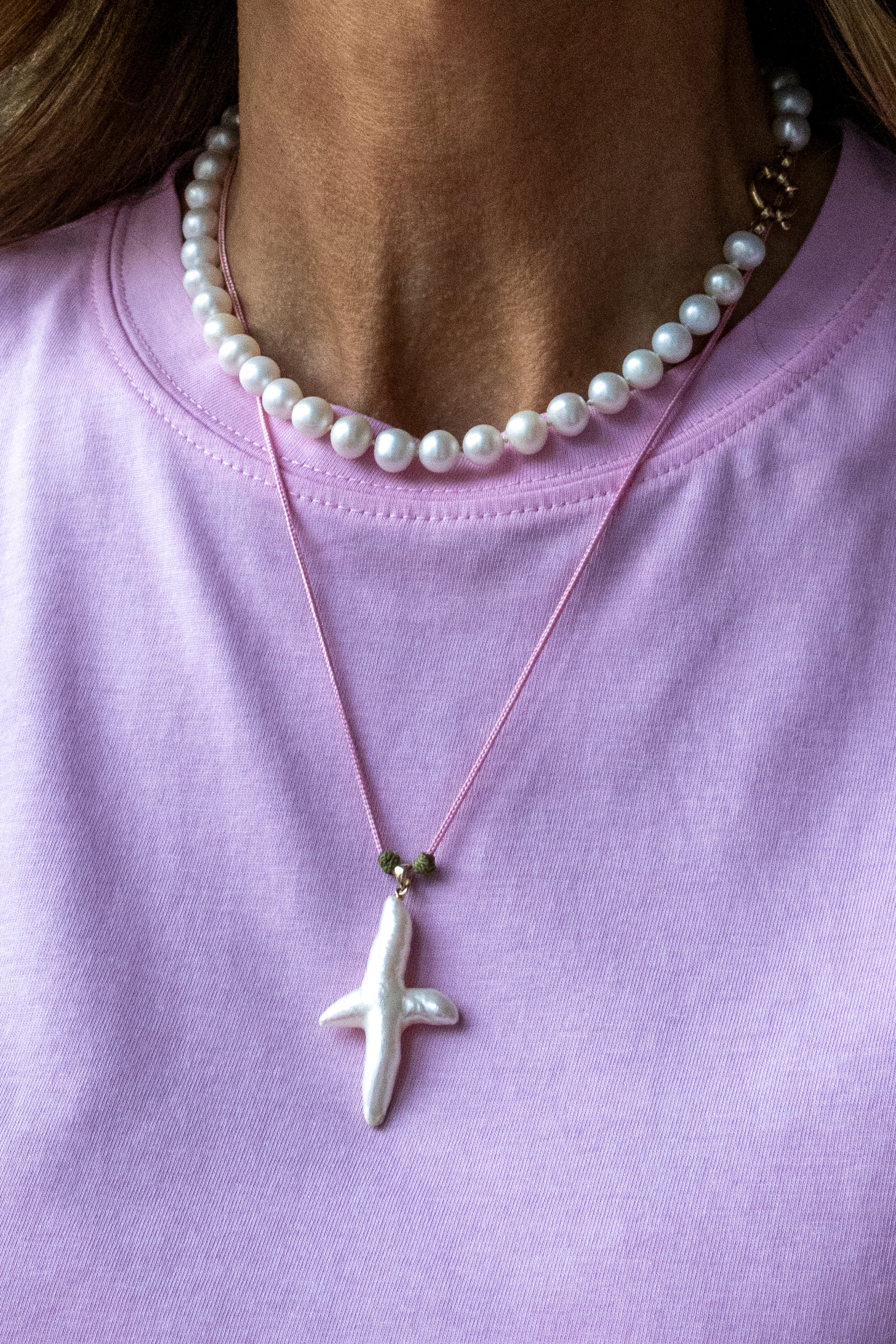 De Pink Cross ketting is een subtiel maar toch opvallend stuk, bestaande uit een lange ketting van roze touw met een groot parelkruis.